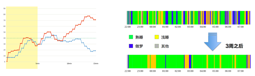 From the other clinical experiment, it indicates the significant positive effect on primary sleeping disorder patients after using Meditation Master’s advanced intervention program. The chart above is a female patient with age 75 who suffering from the severe sleeping disorder for more than 20 years. In the course of her morbidity, she has not found an adequate way to solve or even maintain her sleeping disorder symptom in a long term. However, after continuously using Meditation Master for three weeks, through sleep monitoring (polysomnography), patient’s deep sleep ratio has been significantly improved while her sleep fragmentation was quickly reduced.